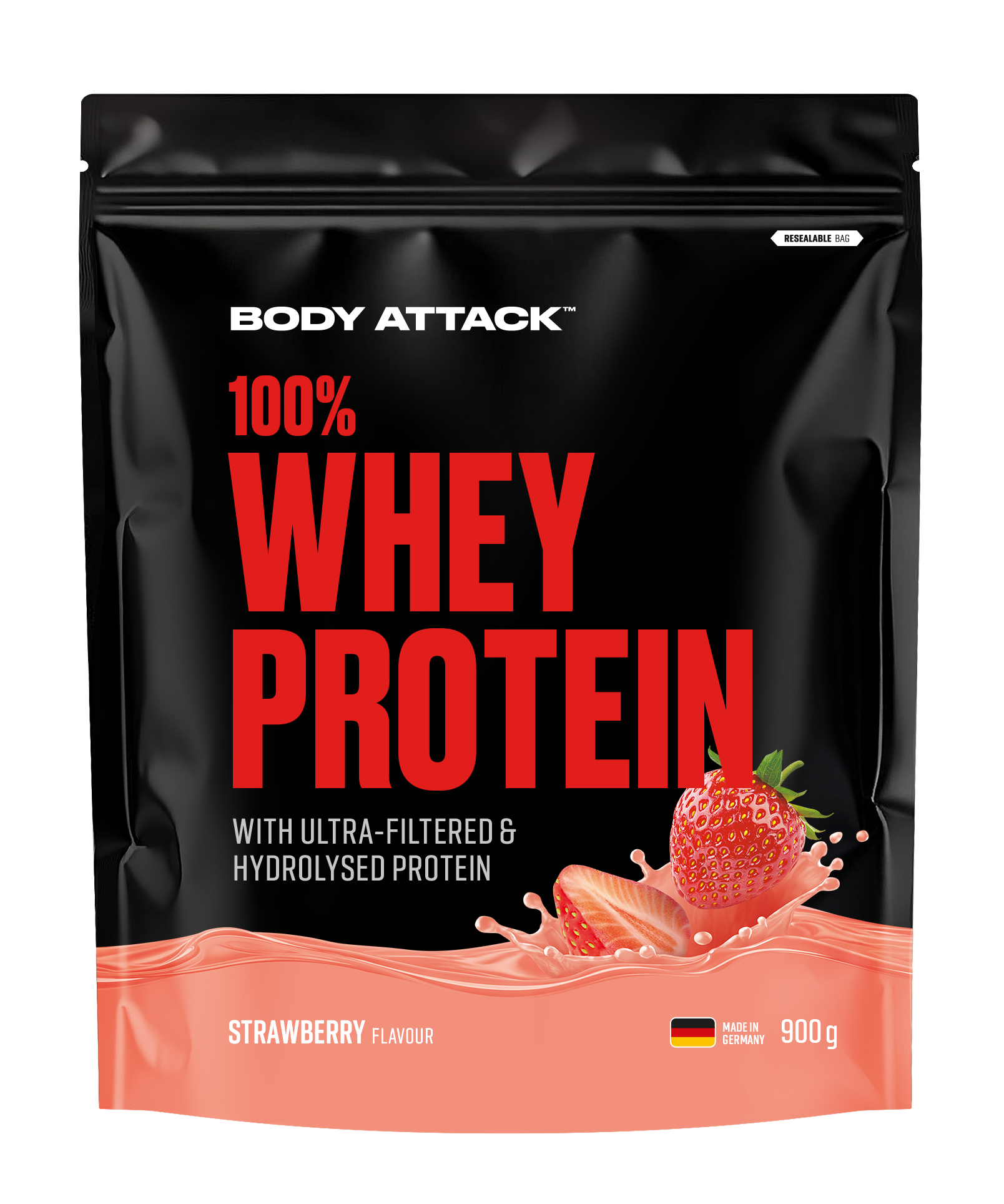 Ultrafiltriertes Molkeneiweiß-Konzentrat (92,6%), Aroma, Molkeneiweißhydrolysat (Optipep®) (2%), Erdbeerfruchtpulver (1%), Trennmittel (Siliciumdioxid), färbendes Lebensmittel (Rote Bete-Pulver), Emulgator (Soja-Lecithin), Süßungsmittel (Acesulfam K, Sucralose), Speisesalz, Säuerungsmittel (Citronensäure).