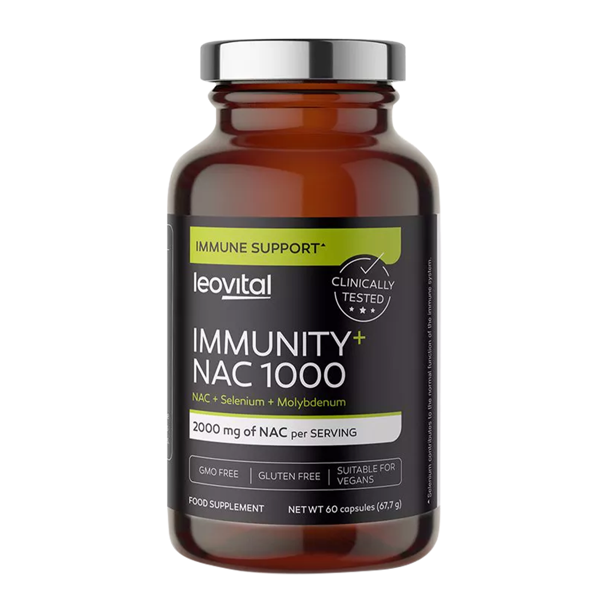 Immunity+ NAC 1000 von Leovital ist ein hochwertiges Nahrungsergänzungsmittel zur Unterstützung des normalen Immunsystems und der normalen Leberfunktion. Jede Kapsel enthält 1.000 mg N-Acetylcystein (NAC). Ergänzt wird die Formel durch Selen und Mangan, die eine Rolle im Zellschutz und Stoffwechsel spielen. Die vegane Kapselhülle aus Cellulose macht das Produkt auch für Vegetarier und Veganer geeignet. Ob zur Unterstützung in stressigen Zeiten oder als gezielte Ergänzung bei erhöhtem Bedarf: Immunity+ NAC 1000 bietet eine durchdachte Kombination für mehr Wohlbefinden und Schutz von innen!